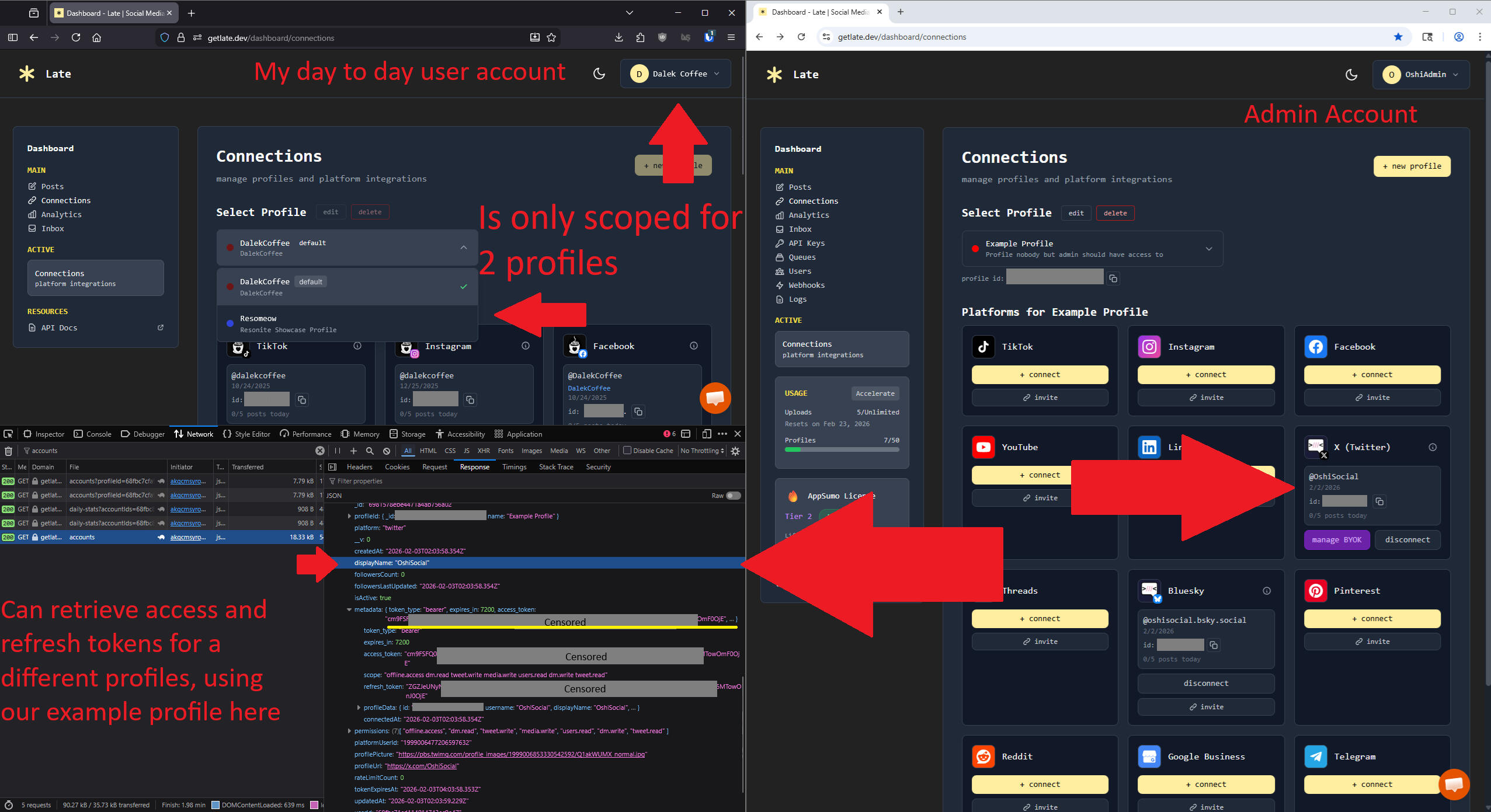 GETLATE acknowledged and promptly patched the issue as well as provided public vulnerability disclosure approval.This write-up is a technical case study and learning resource. Summary Under certain tenant configurations, authenticated users received web request responses containing data about all profiles within a tenant, even those outside their access scope.These responses included OAuthaccess_token and refresh_token values in plaintext for connected social media accounts, allowing unauthorized third-party actions outside the platform’s intended permission model.Platform: GetLate.Dev Reproduction Steps 1- Login as Tenant Admin.